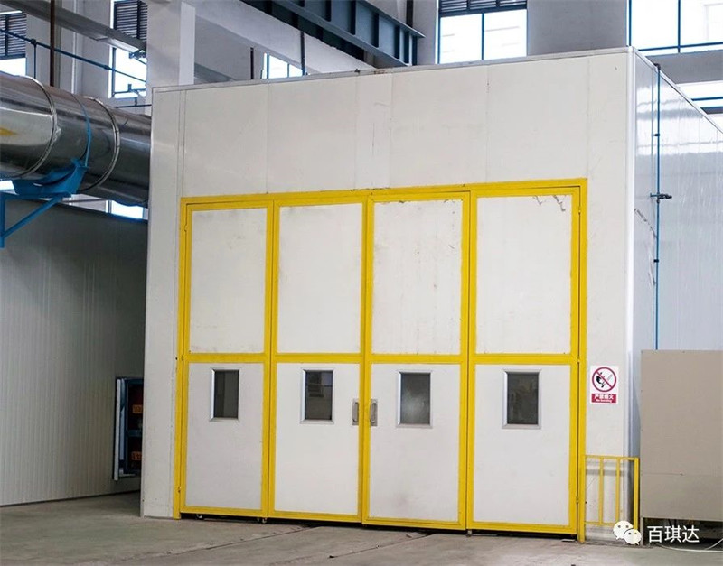 水性漆以水作調(diào)和,與油性漆用化學(xué)稀釋劑相比,優(yōu)勢非常明顯:綠色環(huán)保、無廢氣排放、沒有刺鼻氣味,非常符合健康環(huán)保的要求。根據(jù)車間生產(chǎn)工況,同時為了節(jié)省車間空間,改造后的噴漆房采用噴晾烘一體式設(shè)計(jì),工件使用叉車或液壓車進(jìn)出,工件全部就位后降下卷簾門形成密閉環(huán)境,開啟送風(fēng)及排風(fēng)裝置,進(jìn)行噴漆作業(yè),噴漆時,噴漆房內(nèi)有害氣體濃度遠(yuǎn)遠(yuǎn)低于《工業(yè)企業(yè)設(shè)計(jì)衛(wèi)生標(biāo)準(zhǔn)》中車間空氣中有害物質(zhì)最高允許濃度,氣流通過排風(fēng)過濾系統(tǒng)流向排風(fēng)道,經(jīng)廢氣處理裝置處理后排出,排出氣體符合《大氣污染物綜合排放標(biāo)準(zhǔn)》的標(biāo)準(zhǔn);噴漆作業(yè)完成后,人員通過側(cè)門撤出,送風(fēng)關(guān)閉,排風(fēng)改為內(nèi)循環(huán),開啟熱風(fēng)循環(huán)模式進(jìn)行晾干工序,待晾干完成并冷卻后升起卷簾門吊出工件并進(jìn)入下一批作業(yè)。