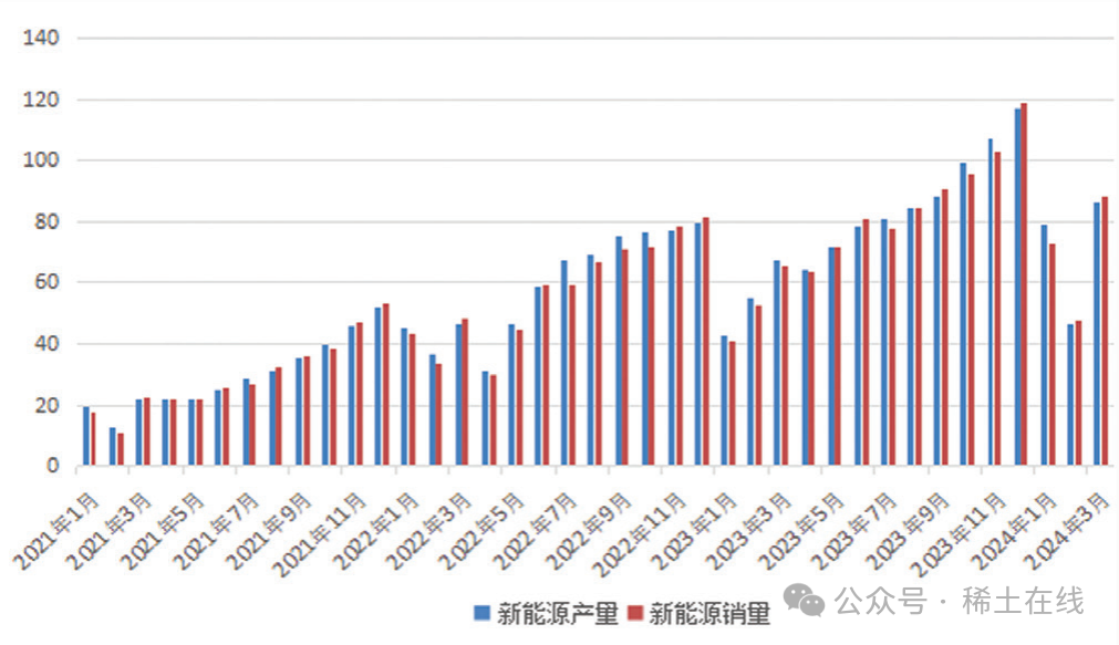 2024 年 1 ~ 3 月,我國汽車產(chǎn)銷分別完成 660.6 萬輛和 672 萬輛,同比分別增長 6.4% 和 10.6%(見圖 1)。其中新能源汽車產(chǎn)銷分別完成 211.5 萬輛和 209 萬輛,同比分別增長 28.2% 和 31.8%。其中新能源汽車出口30.7 萬輛,同比增長 23.8%。同比數(shù)據(jù)全面增長,說明我國汽車工業(yè)仍然處于高速成長期。另一方面,1 月和 2 月連續(xù)出現(xiàn)環(huán)比下降,只是恢復(fù)了 2021 年和 2022 年的同期水平,結(jié)合兩個(gè)月綜合數(shù)據(jù)全面同比上升,可以判斷我國汽車產(chǎn)業(yè),特別是新能源汽車產(chǎn)業(yè)將繼續(xù)成為拉動(dòng)稀土產(chǎn)業(yè)發(fā)展的主要?jiǎng)恿?。出口?shù)據(jù)同比大幅增長,說明我國汽車產(chǎn)業(yè)出海前景廣闊。4 月份比亞迪等新能源龍頭企業(yè)發(fā)布了 3 月份銷量,比亞迪銷量超過 30 萬輛,總體情況好于預(yù)期。根據(jù)最新的中國汽車協(xié)會(huì)數(shù)據(jù),2024 年我國新能源汽車產(chǎn)銷將保持 20% 以上的增長率,預(yù)計(jì)全年銷量超過 1220 萬輛。
