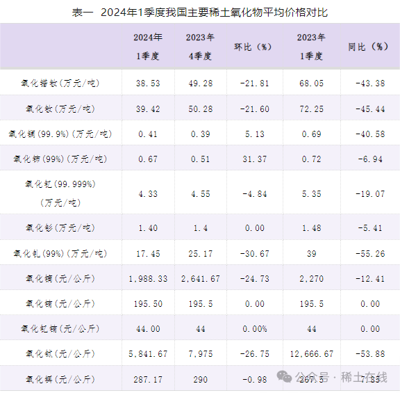 2024 年 1 季度我國主要稀土氧化物、金屬產(chǎn)品平均價(jià)格對比見表一、表二。