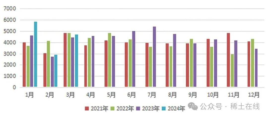 2024 年 1 ~ 3 月,我國稀土進(jìn)口量分別達(dá)到 14071 噸、8215 噸 和 13411 噸, 同比分別增加8.3%、減少 42.9% 和增長 4.9%。
