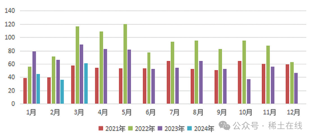 2024 年 1 ~ 3 月,稀土出口金額分別為 0.45 億美元、0.37 億美元和 0.61 億美元,同比分別減少 43.8%、44.8% 和 31.5%(見圖 9)。