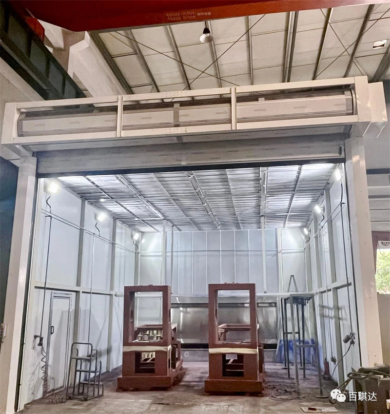 水性漆以水作調(diào)和,與油性漆用化學(xué)稀釋劑相比,優(yōu)勢非常明顯:綠色環(huán)保、無廢氣排放、沒有刺鼻氣味,非常符合健康環(huán)保的要求。根據(jù)車間生產(chǎn)工況,同時為了節(jié)省車間空間,改造后的噴漆房采用噴晾烘一體式設(shè)計(jì),工件使用叉車或液壓車進(jìn)出,工件全部就位后降下卷簾門形成密閉環(huán)境,開啟送風(fēng)及排風(fēng)裝置,進(jìn)行噴漆作業(yè),噴漆時,噴漆房內(nèi)有害氣體濃度遠(yuǎn)遠(yuǎn)低于《工業(yè)企業(yè)設(shè)計(jì)衛(wèi)生標(biāo)準(zhǔn)》中車間空氣中有害物質(zhì)最高允許濃度,氣流通過排風(fēng)過濾系統(tǒng)流向排風(fēng)道,經(jīng)廢氣處理裝置處理后排出,排出氣體符合《大氣污染物綜合排放標(biāo)準(zhǔn)》的標(biāo)準(zhǔn);噴漆作業(yè)完成后,人員通過側(cè)門撤出,送風(fēng)關(guān)閉,排風(fēng)改為內(nèi)循環(huán),開啟熱風(fēng)循環(huán)模式進(jìn)行晾干工序,待晾干完成并冷卻后升起卷簾門吊出工件并進(jìn)入下一批作業(yè)。