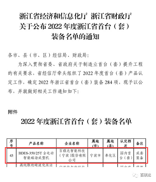 發(fā)布時(shí)間:2023-01-29 點(diǎn)擊量:678近日,浙江省經(jīng)濟(jì)和信息化廳、浙江省財(cái)政廳公布了2022年度浙江省首臺(tái)(套)裝備名單,公司產(chǎn)品“BDES-350/25T全電動(dòng)智能磁場(chǎng)成型機(jī)”喜獲國(guó)內(nèi)首臺(tái)(套)稱(chēng)號(hào)。