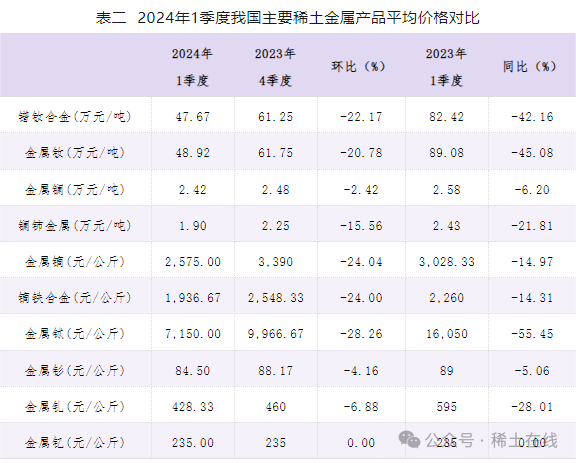 2024 年 1 季度我國主要稀土氧化物、金屬產(chǎn)品平均價(jià)格對比見表一、表二。