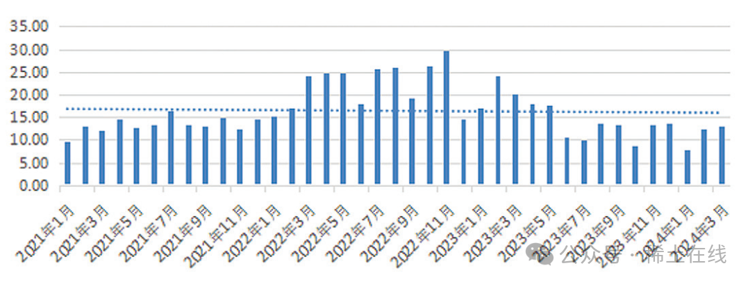 2024 年 1 ~ 3 月,稀土出口單價(jià)分別為 7.74 美元 / 公斤、12.52 美元 / 公斤和 13.04 美元 / 公斤,低于 2023 年 4 季度的水平,但是逐月回升,同比分別下降 52.6%、23.3% 和 35.2%(見圖 10)。