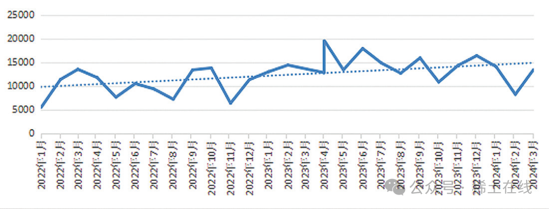 2024 年 1 ~ 3 月,我國稀土進(jìn)口量分別達(dá)到 14071 噸、8215 噸 和 13411 噸, 同比分別增加8.3%、減少 42.9% 和增長 4.9%。